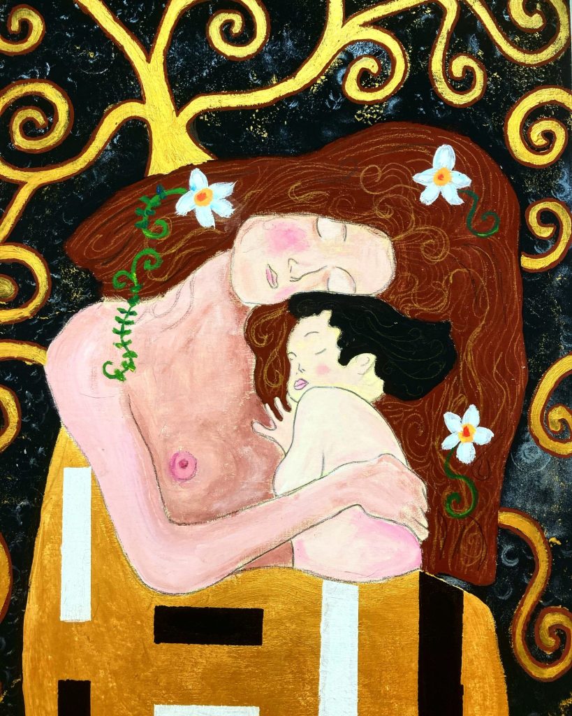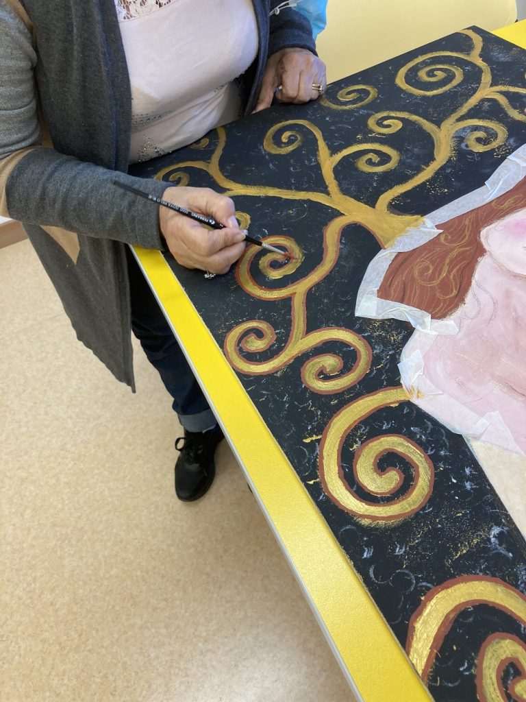 Lunedì 13 febbraio 2023 è stata installata all’ingresso di Casa Madre Teresa un’opera pittorica realizzata da un gruppo di 8 Ospiti del centro Diurno “San Raffaele” che ha partecipato, da Settembre a Dicembre 2022, al laboratorio educativo di pittura.L’opera si ispira chiaramente allo stile del pittore austriaco Klimt ed è la sintesi di tre quadri famosi: il soggetto centrale riprende la maternità rappresentata da Klimt ne “Le tre età della donna”, il vestito richiama le decorazioni del famoso “Bacio”, mentre sullo sfondo appare “L’albero della vita”.