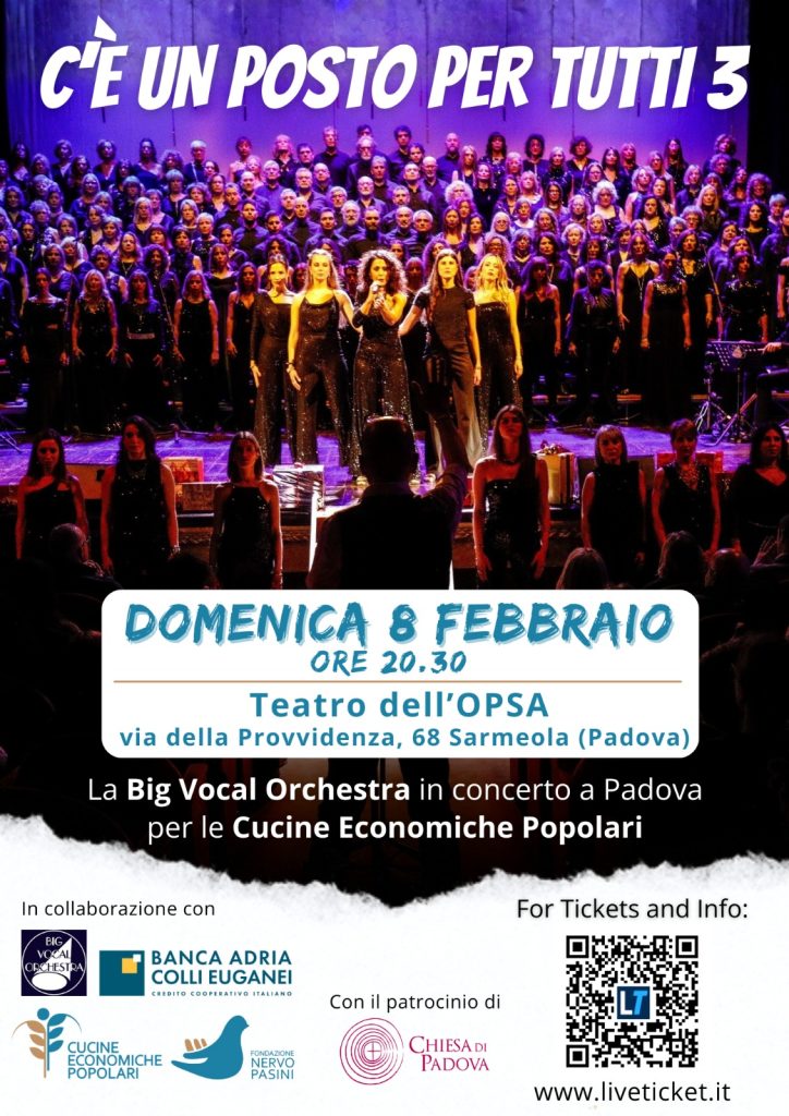 Dopo due edizioni sold out che hanno emozionato Padova e portato allo scoperto la forza discreta della solidarietà, la Big Vocal Orchestra (oltre 200 voci dirette dal maestro Marco Toso Borella) torna ad affiancare le Cucine Economiche Popolari con un nuovo concerto dedicato a chi vive situazioni di fragilità, e che quest’anno si terrà nel Teatro dell’OPSA. Ogni biglietto andrà a sostenere i servizi che le Cucine Economiche Popolari offrono ogni giorno a chi vive condizioni di difficoltà.