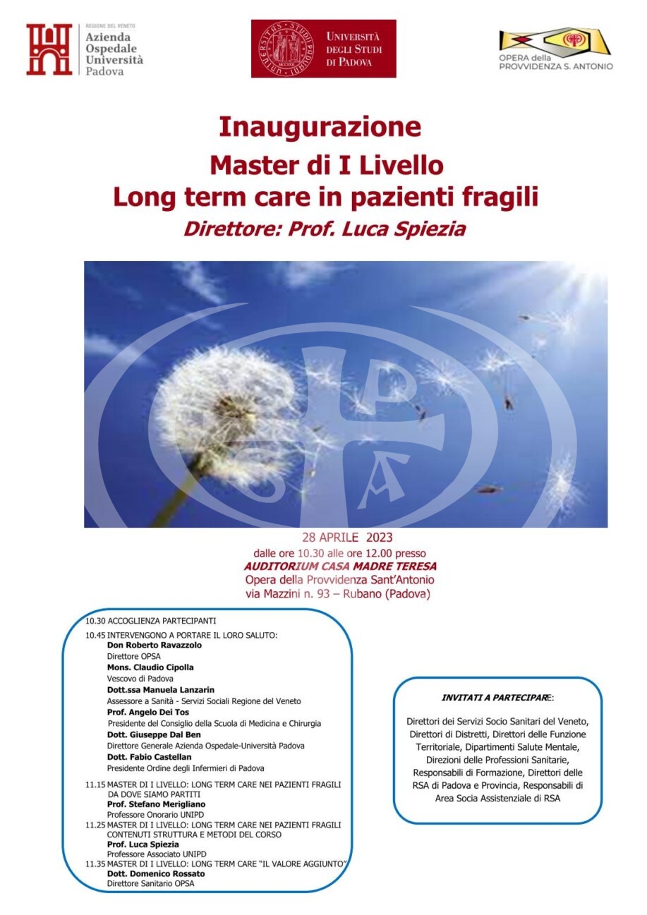 Il prossimo novembre a Padova si terrà il Master di I livello “Long term care in pazienti fragili” organizzato da Azienda Ospedaliera di Padova, Università di Padova, e dall’Opera della Provvidenza Sant’Antonio. Venerdì 28 aprile alle 10.30 all’Opera della Provvidenza a Rubano (Padova), presso il teatro del C.S. “Casa Madre Teresa di Calcutta” vi sarà l’inaugurazione del master, a cui sono invitati …
